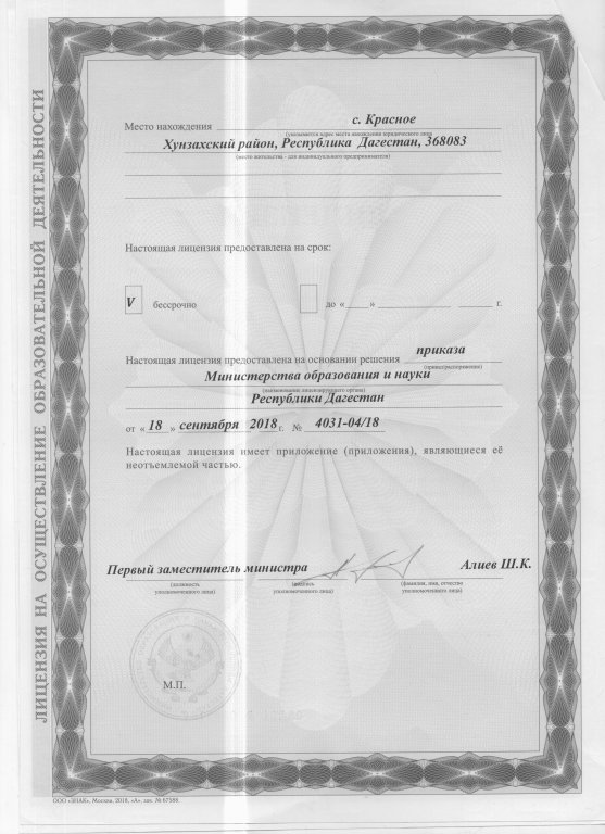 | Адрес местонахождения образовательной организации* | 368083, Республика Дагестан, Кумторкалинский район, п/о Аджидада, с. Красное Хунзахского района. |